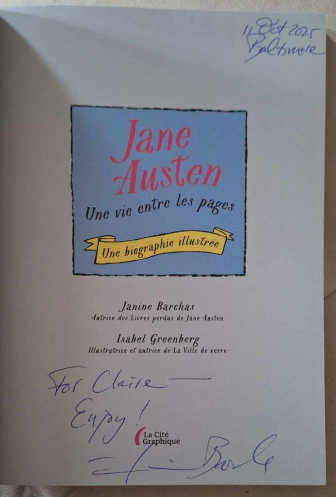 Le récit convainc par son intelligence visuelle et narrative : les scènes de la vie réelle se distinguent par des tons bleus et jaunes, tandis que l’imaginaire et les univers romanesques se déclinent en couleurs chaudes. Ce contraste, comme l’a révélé la spécialiste austenienne Janine Barchas lors de notre rencontre à une conférence sur Jane Austen aux JASNA (Jane Austen Societies of North America) de Baltimore, symbolise le dialogue permanent entre la vie de l’autrice et ses fictions.