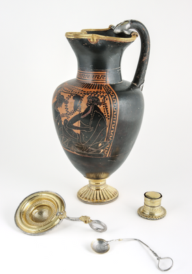 Objet phare de la tombe, l’œnochoé attique3, produite en Grèce, a été transformée par les Celtes : des garnitures en or et en argent y ont été ajoutées, intégrant une iconographie celtique au décor dionysiaque d’origine. Lorsque le vin s’écoule, un masque celtique apparaît inversé, créant un jeu symbolique entre deux univers religieux.